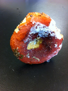 | Figure 2. Russula emetica. Note the fading color of the cap and the large white chunks with a lack of mucus. |